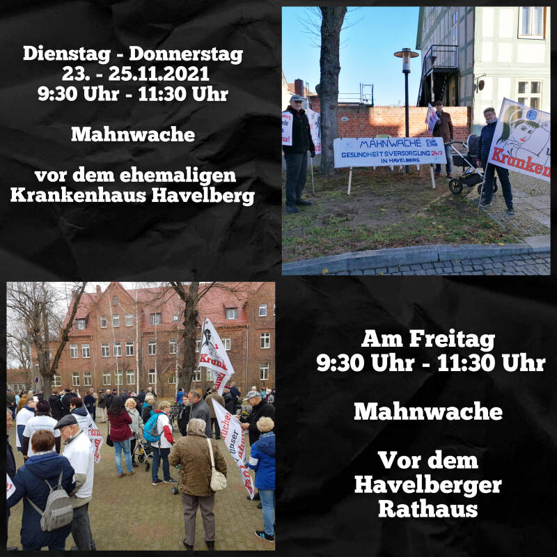 - 01.04.2021/Do. / KEINE DEMO. Stattdessen findet ab 8 Uhr vor dem Krankenhaus eine Mahnwache statt. Ab 8 Uhr werden Mitglieder des Vereins Pro-Krankenhaus-Havelberg an der Treppe unseres ehemaligen Krankenhauses stehen. Alle Bürger sind aufgefordert durch Ablegen einer Blume gegen die Schließung des Krankenhauses zu protestieren.